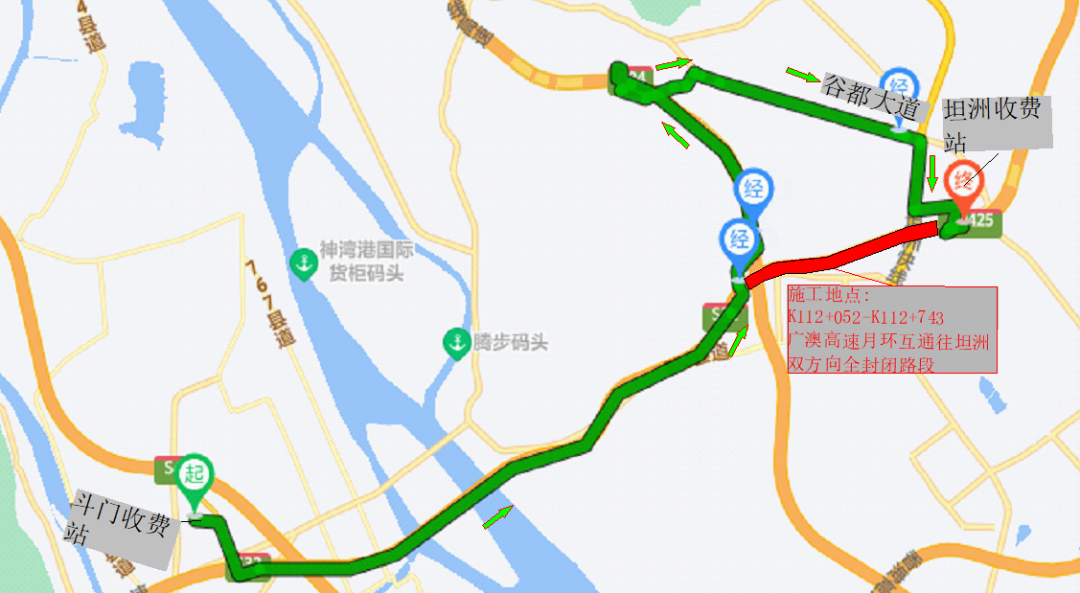 斗门往坦洲方向(东行)绕行路线:斗门收费站→月环互通→广珠西线→三乡收费站下→谷都大道→坦洲收费站