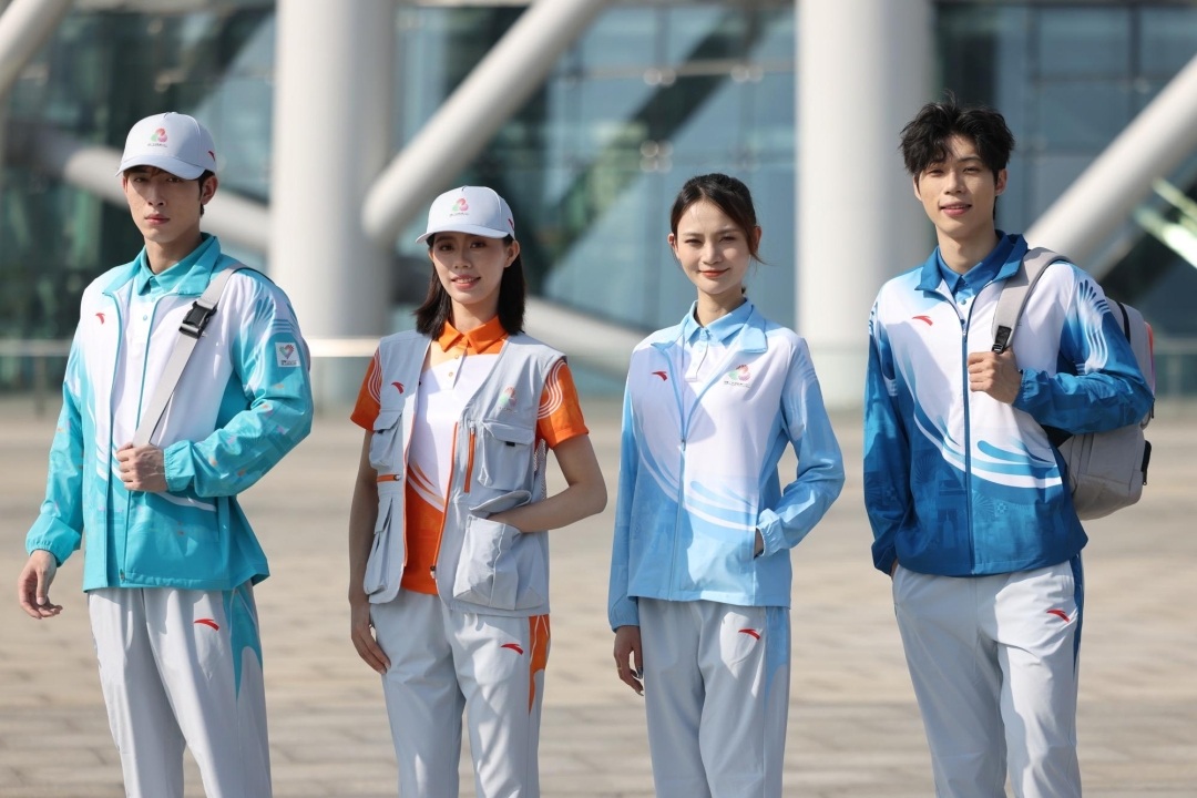 第十五届运动会赛会制服:从左到右依次为安踏为志愿者、媒体、工作人员、技术官员打造的制服。