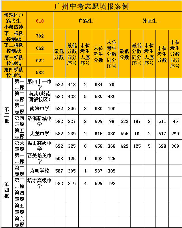 4.第六志愿禺山中学外区生最低录取分数为622分,末位考生志愿序号为5,末位考生分数为628,代表其可以录到第四梯度第五志愿的628分,小帮分数不够,故最终在第三批次未能被录取;