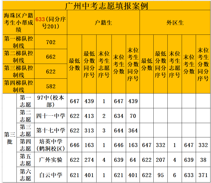 6.第六志愿白云中学外区生最低录取分数为622分,末位考生志愿序号为6,末位考生分数为633分,代表其外区生可以录到第三梯度第四志愿的633分,小帮刚好分数达到,且同分序号高于371,故成功被白云中学录取.