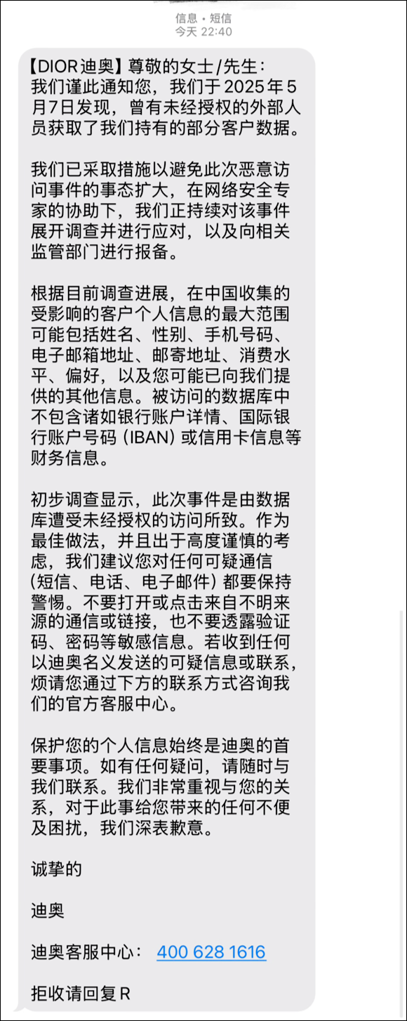 5月12日晚,法国奢侈品巨头迪奥(Dior)向中国客户发送短信表示,公司于2025年5月7日发现,曾有未经授权的外部人员获取了其持有的部分客户数据。迪奥表示,已采取措施以避免此次恶意访问事件的事态扩大,在网络安全专家的协助下,公司正持续对该事件展开调查并进行应对,以及向相关监管部门进行报备。