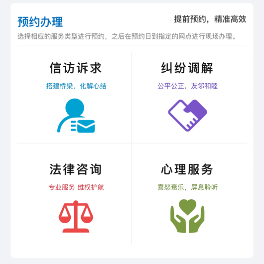 为方便各位街坊邻居,即日起,区综治中心在线上推出“荔综治”小程序。打开“荔综治”小程序后,首页找到“预约办理”模块,大家就可以按需选取各类服务啦。提交服务预约后需等待工作人员核实确认。
