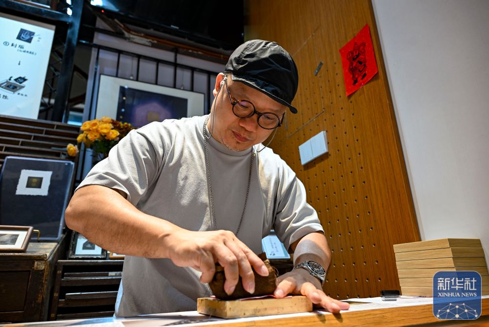 永庆坊一家活字印刷店店主赖朝阳在制作活字印刷装饰品(5月13日摄)。