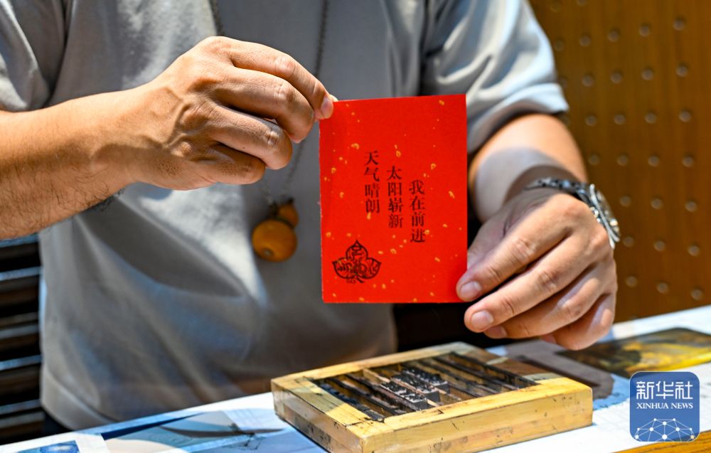 永庆坊一家活字印刷店店主赖朝阳展示自己的活字印刷作品(5月13日摄)。