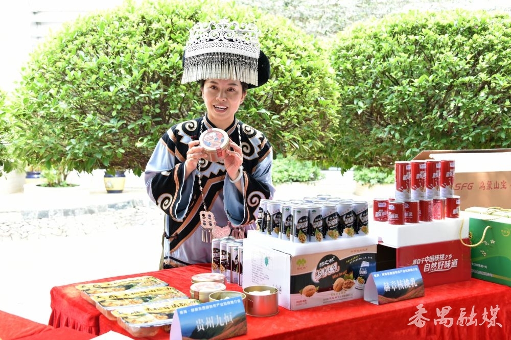 香港演员“八两金”带着儿子也来到现场为赫章打call。他说,多年前曾到贵州培训演员,就深刻感受到当地民众的淳朴热情。今天不仅品尝到赫章核桃的醇厚甘香,更通过现场推介了解到赫章是一个风景优美、资源丰富的地方,希望能用自己30多年在影视界的影响力大力推介赫章,邀请更多人走进赫章,品尝赫章美食,感受赫章风土人情。