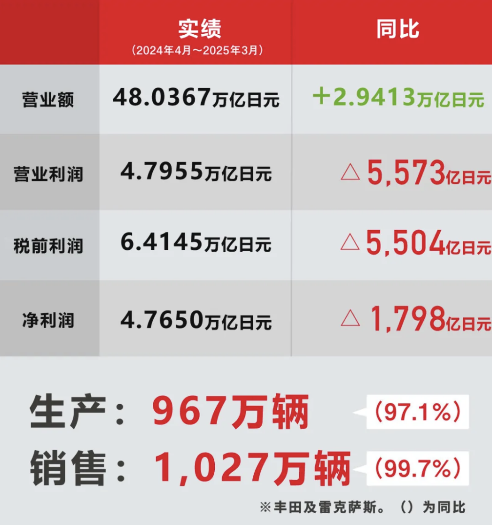 近期,丰田公布截至2025年3月31日的2024财年联合财务报表。数据显示,丰田2024财年销量为1027万辆,生产967万辆,同比均出现小幅度下滑。营业收入实现48.04万亿日元(约人民币2.4万亿元),上一财年为45.1万亿日元(约人民币2.3万亿元),同比增长6.5%;净利润为4.77万亿日元(约人民币2364亿元),上一财年是4.94万亿日元(约人民币2470亿元),同比下滑3.6%。