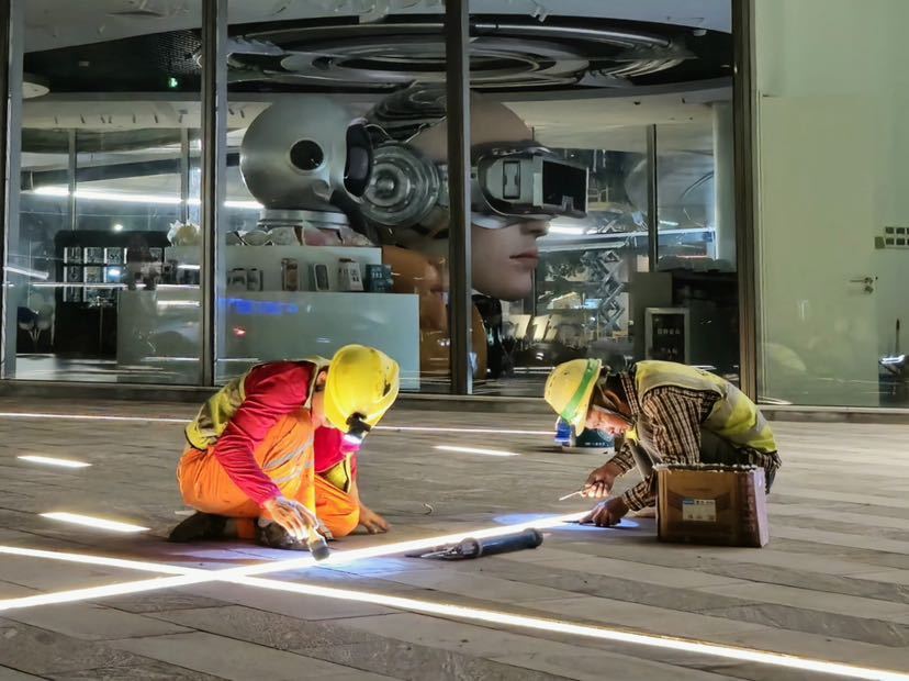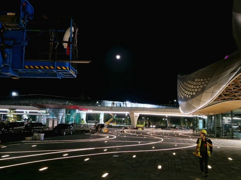 除“荔枝穹顶”外,70组智能激光联动水幕舞台,让停车场区域变身光影剧场。地面设置的线性LED如液态金属般蜿蜒游走,让人行广场变身为光的智慧迷宫。在灯光的勾画映照下,夜幕中的柏桥服务区仿佛成为亮眼的“琥珀”。