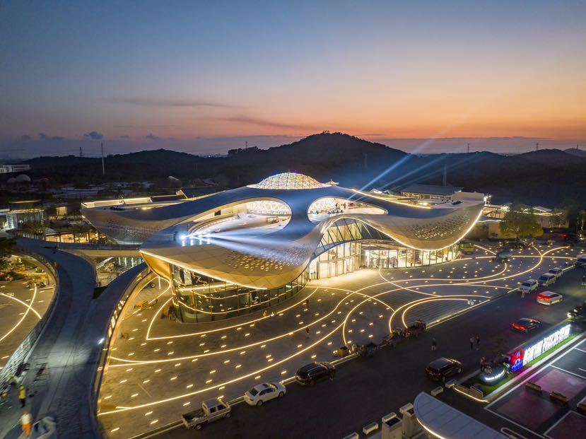 负责柏桥服务区施工建设的保利长大项目经理马朝辉介绍,“荔枝穹顶”由近千台微型光束投射器编织成立体光网,红、黄、绿等七种基色以毫秒级速度无缝渐变,形成流动的“荔枝果壳”视觉效果。