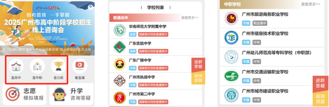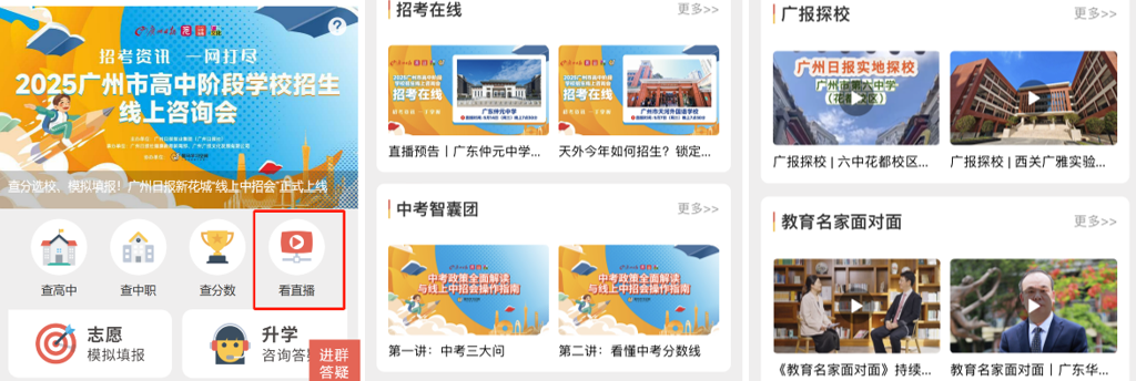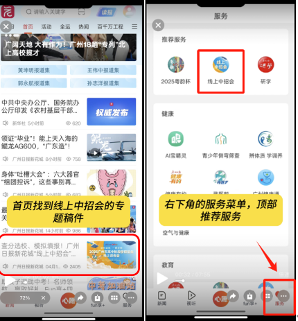 广州日报新花城客户端:首页点击“线上中招会”专题图,或通过“服务”菜单进入。
