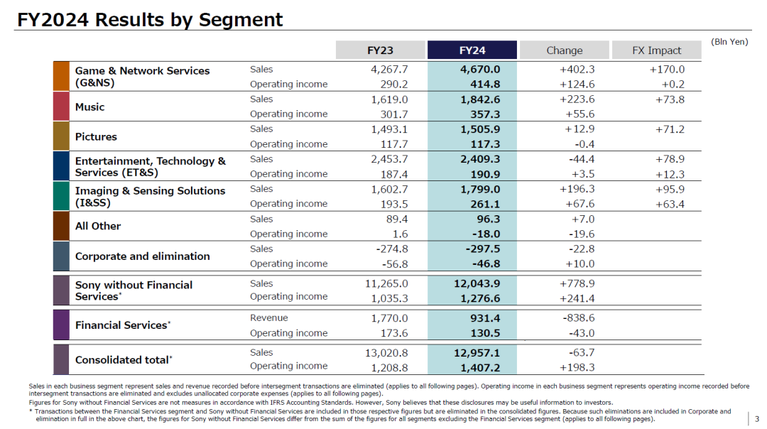 影视业务(Pictures)销售收入为15,059亿日元,营业利润为1,173亿日元,均与去年基本持平。Crunchyroll的付费订阅收入的增长、收购阿拉莫影城的积极效应和院线发行的市场营销成本降低,基本抵消了23财年好莱坞罢工事件导致的电视剧制作交付量减少、在印度市场的网络业务观众和广告等业务收入下降、电影片库产品收入下降及销售下降带来的消极影响。