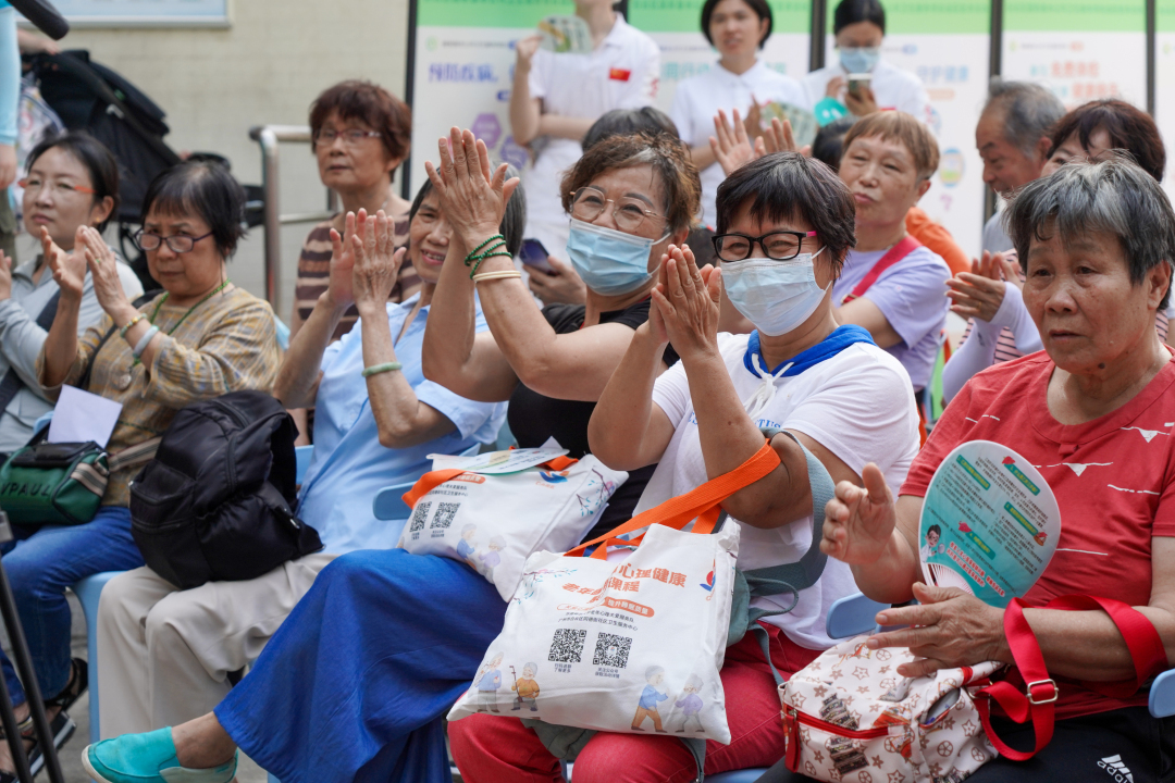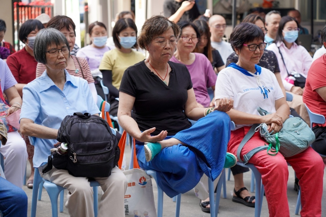 “跟我一起深呼吸,这一刻你像一只小鸟,在天空自由自在地翱翔,眼前的世界色彩斑斓,无比美好……”现场,在轻柔舒缓的音乐声中,居民们轻闭双眼,跟随同德街社区卫生服务中心精神科主治医师莫洁莹的语言引导,练习正念呼吸,感受胸廓的扩张、收敛,让身心充分放松下来。