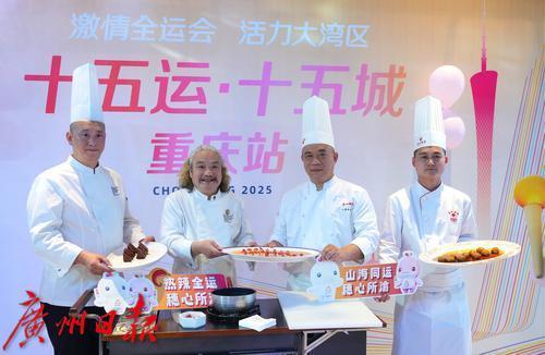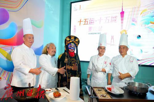 重庆站活动以"美食"为媒,打造体育精神与城市特色的创新表达。重庆厨界大饭店名厨刘波平现场演绎麻辣鲜香的渝派绝技,广州酒家团队则携"食在广州"的精致匠心亮相。