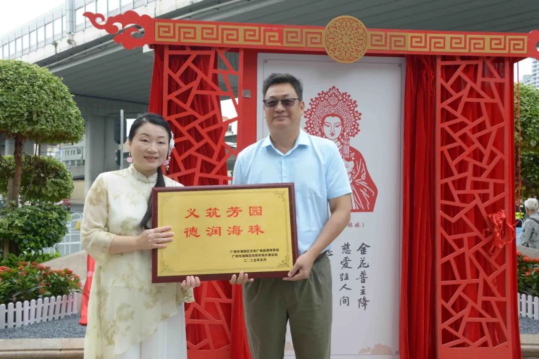 海珠区领导为韩艳颁发《义筑芳园 德润海珠》纪念牌。