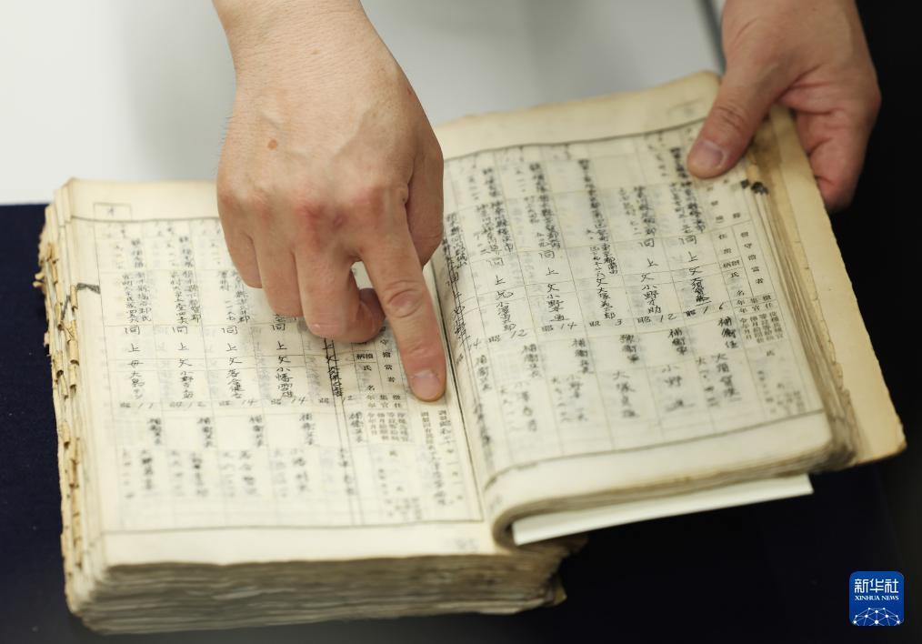 5月14日,在位于日本东京的日本国立公文书馆,工作人员展示侵华日军细菌战部队1644部队的留守名簿。新华社记者 贾浩成 摄