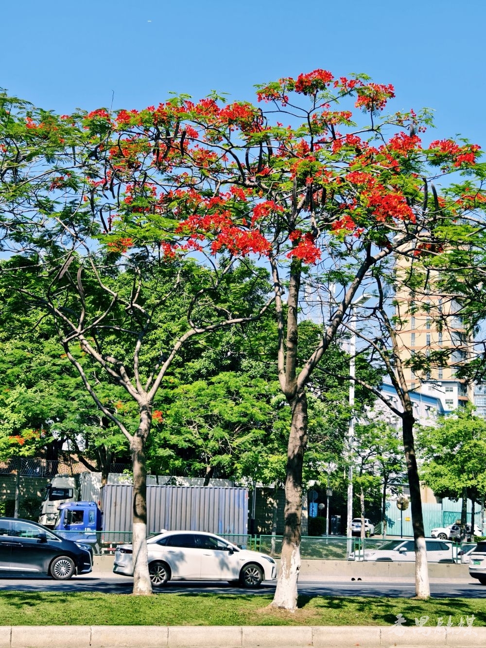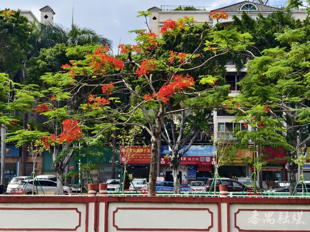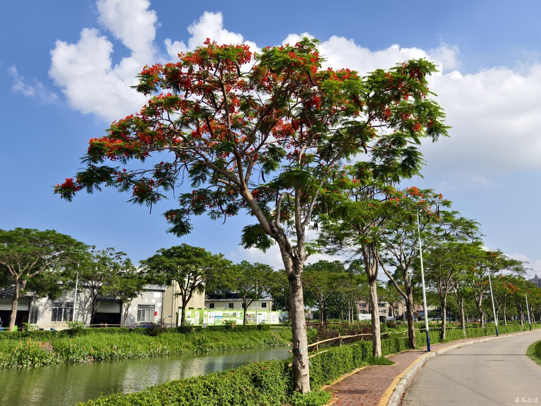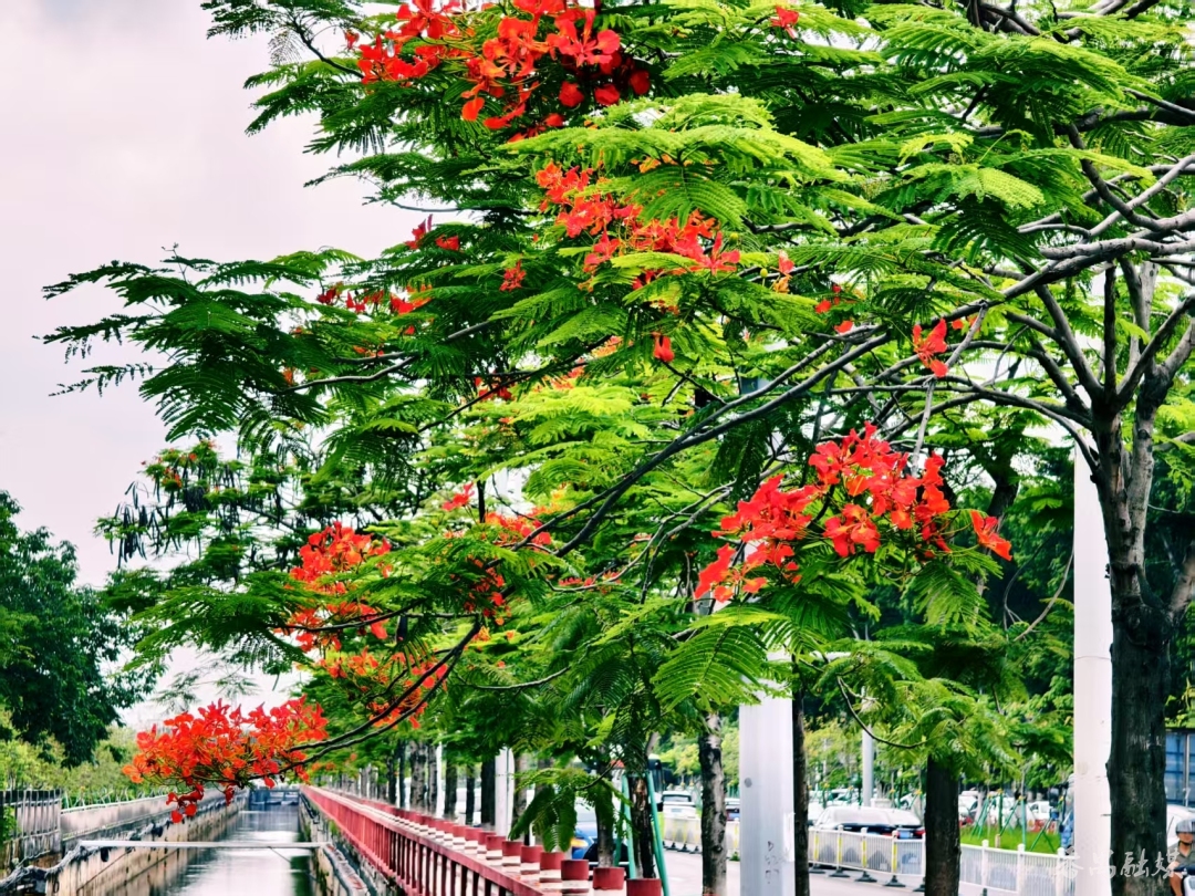 市桥河、雁洲涌等河道旁,一株株凤凰木傲然屹立,满树红艳艳的繁花与翠绿的叶片互相交织,与蓝天碧水构建成一幅绚丽的美景。