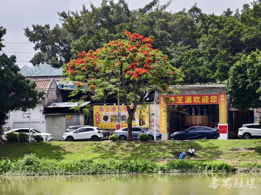 雁洲涌(新桥村段)的凤凰木,红花朵朵缀枝头,与蓝天碧水共同绘就夏日的绚烂