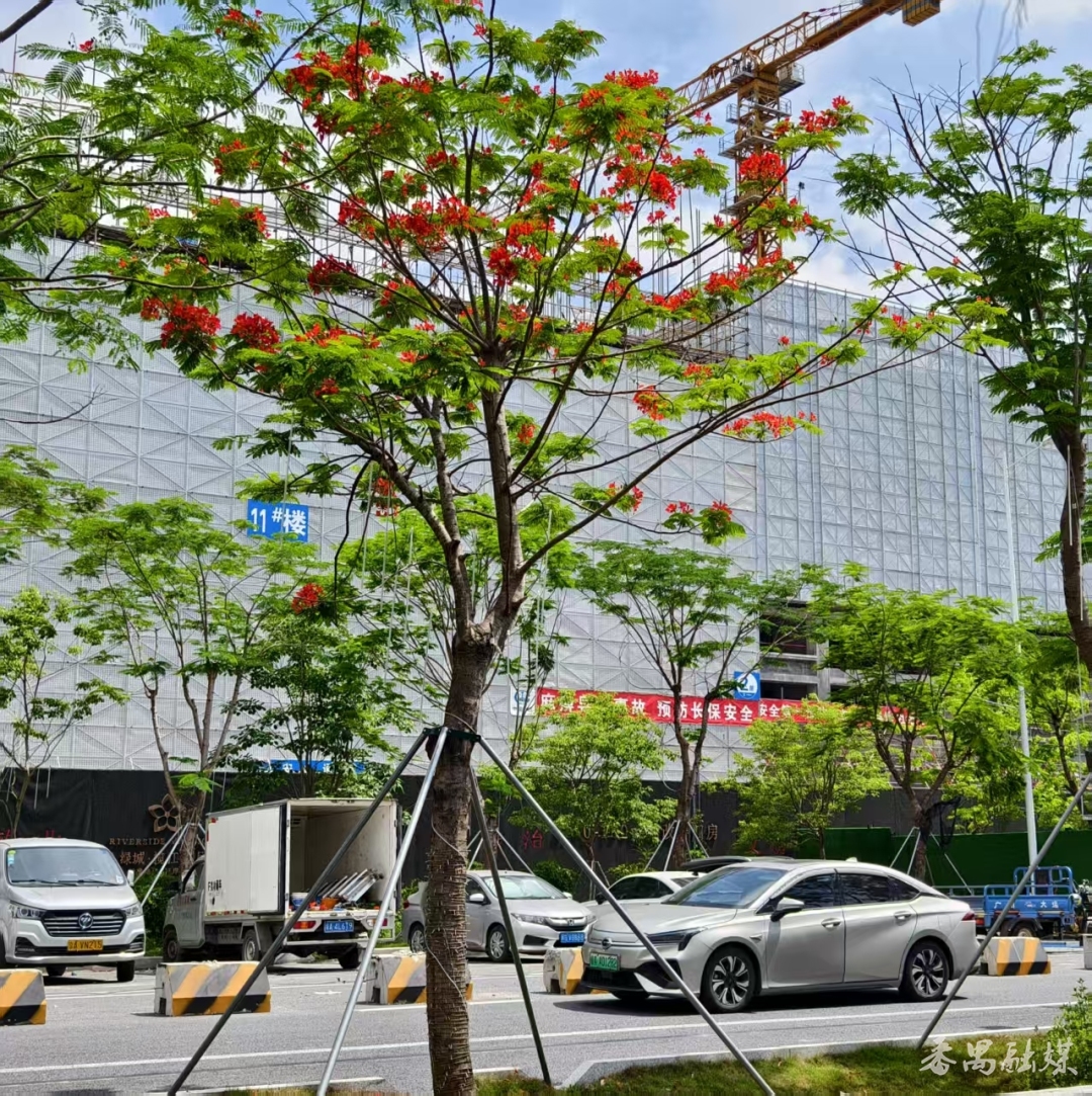 市桥街长堤东路的凤凰木与建设当中的楼房相映