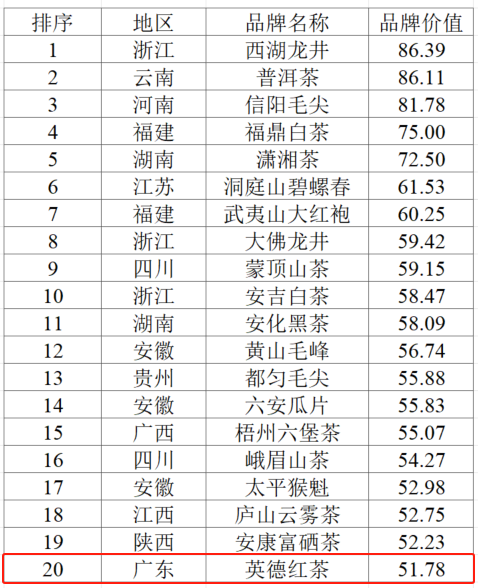 据“中国茶叶区域公用品牌价值评估研究”专项课题最新发布的《2025中国茶叶区域公用品牌价值评估报告》显示,2025年,广东英德红茶公用品牌价值达51.78亿元,在全国135个茶叶品牌中位列第20位,首次位居全国红茶类第1位。当前,广东英德红茶种植面积已达18.16万亩,综合产值90.45亿元。