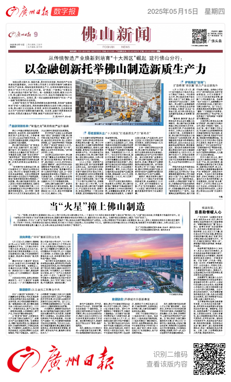 从首创“智造之光”服务品牌破解技改融资难题,到创新“金融链长制”护航十大园区建设,再到构建跨境服务生态助力佛山制造企业出海,佛山建行正以全链条、多维度、系统化的金融服务,为这座制造业大市产业转型升级提供着关键支撑。在这里,金融不再是简单的资金供给,而是成为重组生产要素、赋能产业跃迁的“催化剂”。