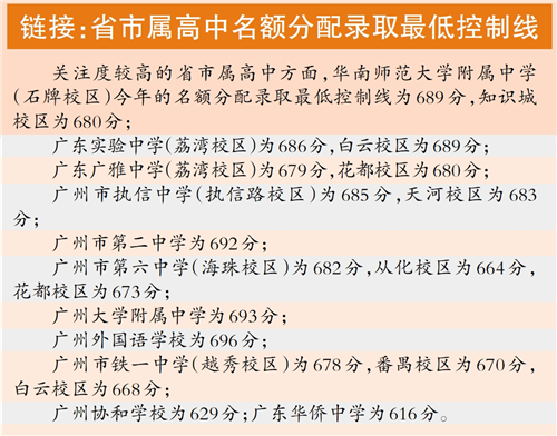 受去年在第三批次对户籍生的录取最低分数影响,10所中学今年的名额分配录取最低控制线有所降低。其中,分数降低最多的为六中从化校区,该校今年的名额分配录取最低控制线为664分,较去年降低15分;其次为南武中学校本部,今年为633分,较去年降低10分;培英中学鹤洞校区今年为611分,较去年降低8分;广雅中学荔湾校区今年为679分,较去年降低5分;铁一中学番禺校区为670分,较去年降低4分;从化中学今年为572分,较去年降低4分;华附知识城校区今年为680分,较去年降低3分;真光中学校本部今年为643分,较去年降低3分;象贤中学今年为619分,较去年降低3分;华侨中学今年为616分,较去年降低2分。