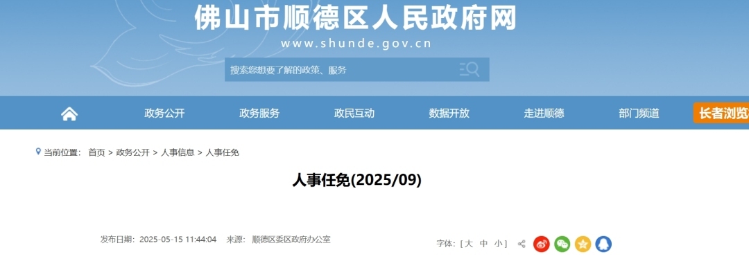 顺德区政府2025年4月份人事任免信息: