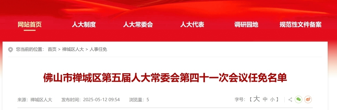 2025年5月8日佛山市禅城区第五届人大常委会第四十一次会议审议通过,决定任命: