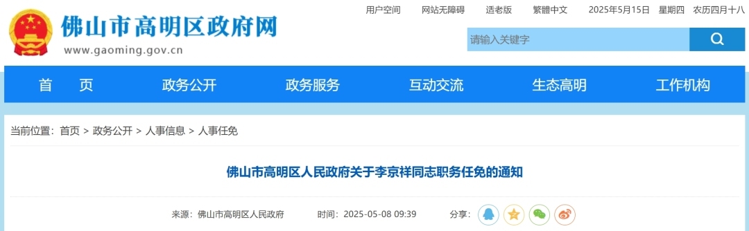 近日,佛山市禅城区人大官网、顺德区政府官网、高明区政府官网发布最新人事任免。
