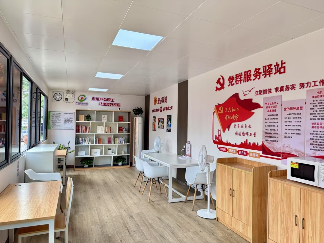 驿站占地面积近50平方米,分为基础服务区、休闲文化区与健康关怀区三大板块,功能设置覆盖生活全场景。基础服务区配备空调、饮水机、微波炉、手机超充、爱心药箱等设施,满足“渴能喝水、热能纳凉、累能歇脚”的基本需求;休闲文化区则设有职工书屋、共享Wi-Fi及互动活动空间,定期开展“夏送清凉、冬送温暖”等主题活动,丰富户外劳动者的精神文化生活。健康关怀区引入智能健康检测设备,定期联合共建单位开展中医理疗、职业病防治讲堂等,面向广大户外劳动者及市民乘客免费提供服务,关注劳动者身心状态。