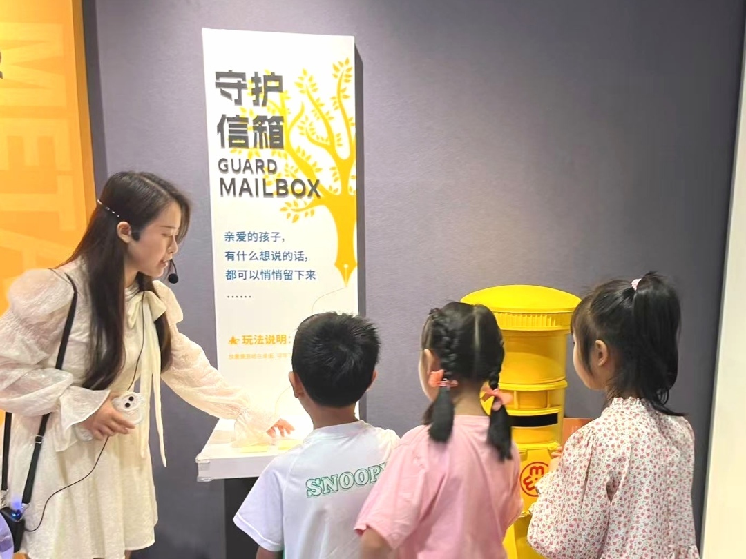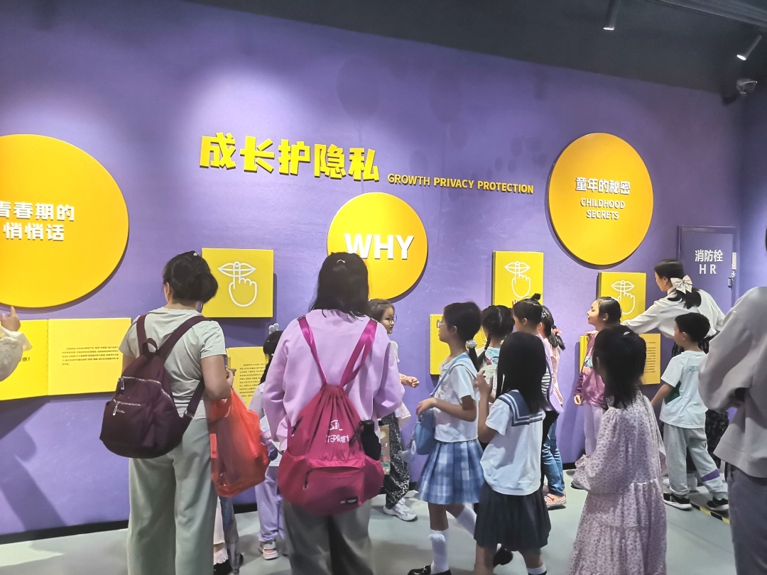 在专业讲解员丁老师的带领下,亲子家庭开启女童馆的沉浸式学习之旅。展馆根据儿童身心发展特点,精心设计“成长五部曲”教育动线,模拟青春期成长的各个阶段:成长初体验、成长护隐私、成长遇危险、成长有保护、成长向未来。同时借助版面图解、视频讲解和物理互动装置等多种形式让儿童在沉浸式体验中认识自己的身心变化,学习辨别和应对危险情境,并且引导孩子们思考未来向往的各个职业,在成长模拟中体会不同阶段的挑战与机会。