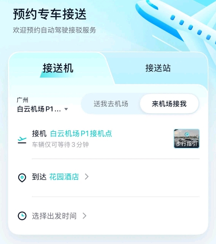 用户可下载“文远出行”App,选择“预约专车接送” —“接送站”或者“接送机”。运营时间为全天24小时,当日18时后可预约次日12时后乘车。
