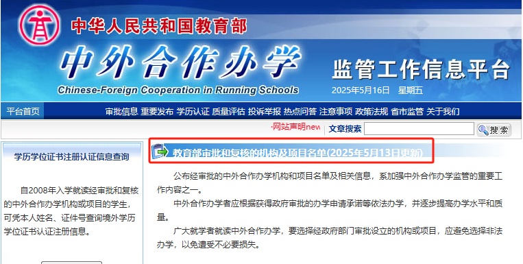 5月13日,教育部中外合作办学监管工作信息平台网站公布2025年全国经审批的中外合作办学机构和项目名单。