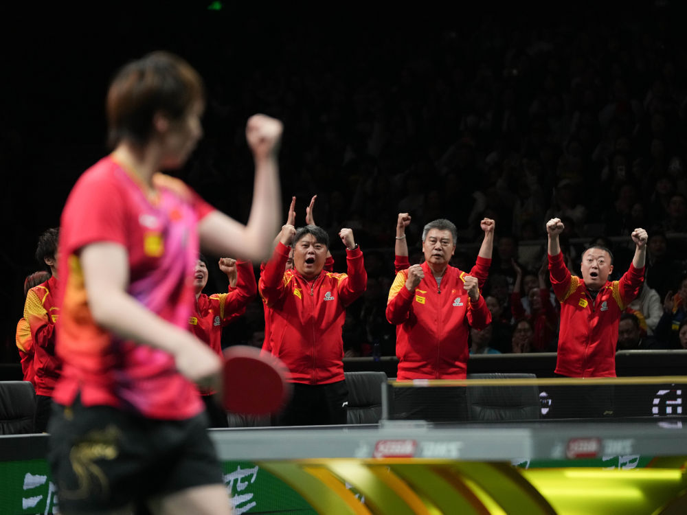 资料图:2024年12月8日,在四川成都举行的2024年成都国际乒联混合团体世界杯决赛中,中国队选手王曼昱在女单比赛中得分后,中国队教练员为她庆祝。新华社记者 胥冰洁 摄