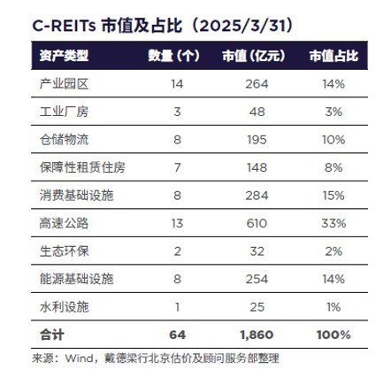 数据显示,截至2025年3月31日,中国内地基础设施公募REITs市场已上市产品共64支,总发行规模达1748亿元,总市值达到1860亿元。2024年REITs市场迎来发行热潮,共有29支REITs上市,其中不动产权类产品上市了19支,收费收益权类产品上市了10支,达到年度上市数量的峰值。消费基础设施作为后起之秀,仅一年发行规模达213亿元,且得益于良好的市场表现,其市值已在2025年一季度超越产业园区,占不动产权类产品的首位,占全市值比例为15%。