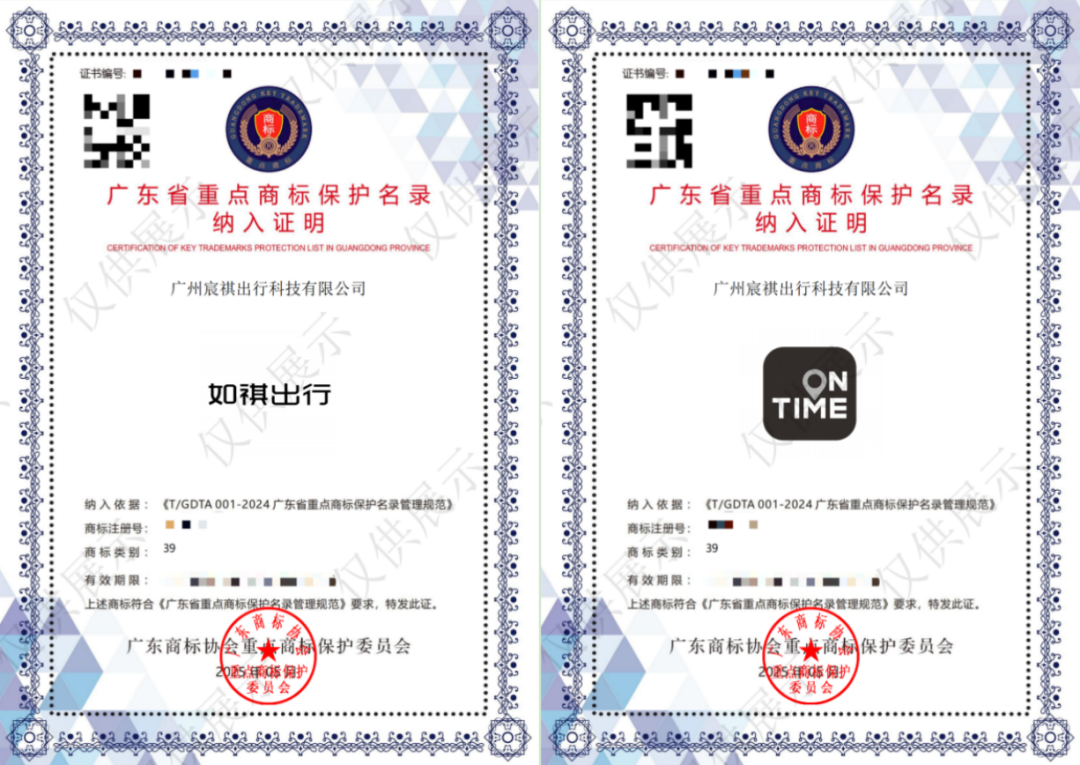 (“如祺出行”“ONTIME”被纳入广东省重点商标保护名录)