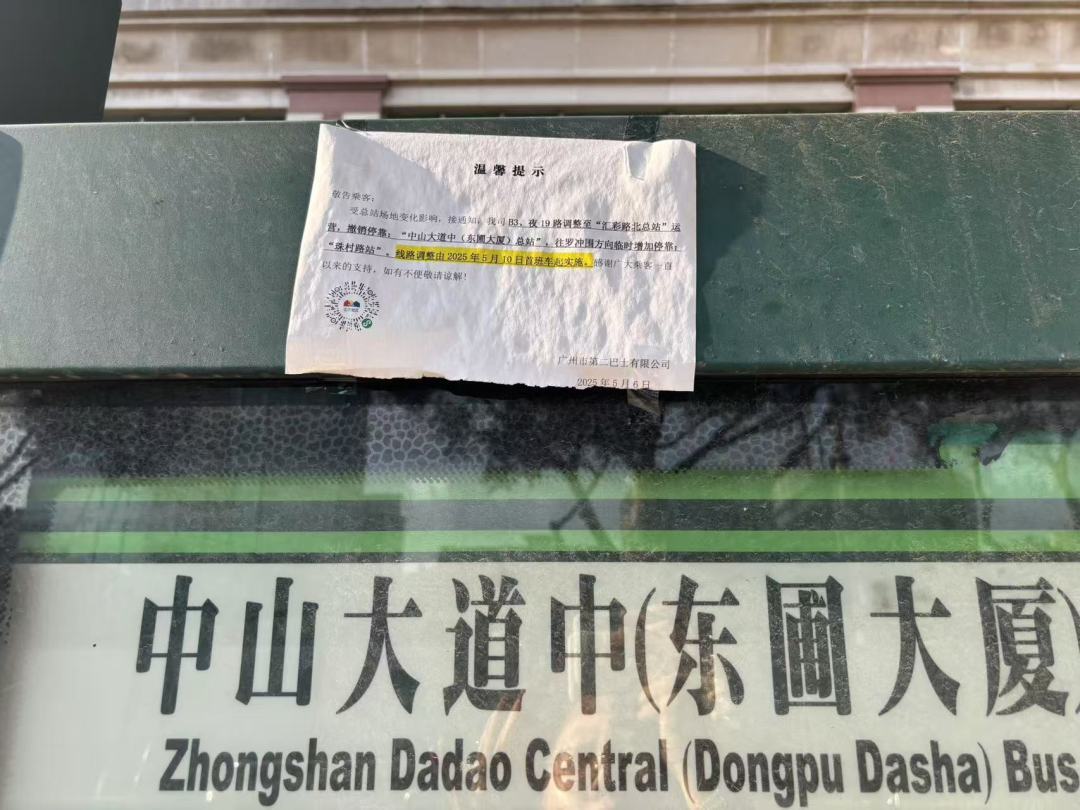 此前,院内设有中山大道中(东圃大厦)总站,记者看到车站站牌上也贴上了5月10日起线路调整的相关提示,其中提到,受总站场地变化影响,接通知,广州市第二巴士有限公司B3、夜19路调整至“汇彩路北总站”运营,撤销停靠:“中山大道中(东圃大厦)总站”,往罗冲围方向临时增加停靠:“珠村路站”。线路调整由2025年5月10日首班车起实施。“刚围上不久,上周还有车进出。”附近市民告诉记者。