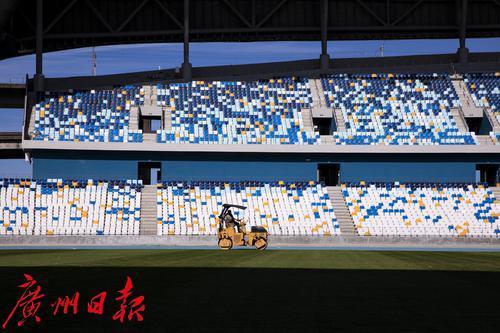 综合体育场上,施工工人正驾驶机器把足球场草坪压平实。