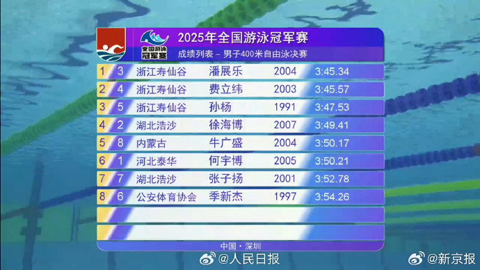 今天,2025年全国游泳冠军赛男子400米自由泳决赛,潘展乐以3分45秒34的成绩夺得冠军,费立纬获得亚军,孙杨第三名。这三位选手都是浙江的运动员。赞!