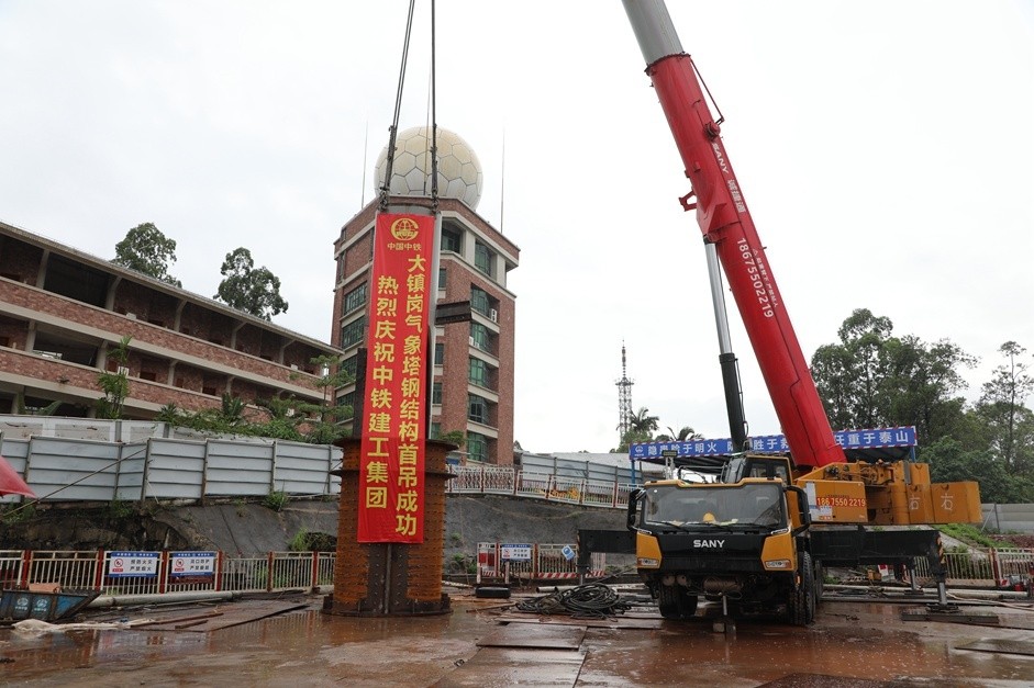 5月16日,由中铁建工集团承建的番禺区大镇岗气象塔项目第一根钢柱吊装完成,标志着这座集气象探测、城市观光、展览及科普于一体的百米级地标建筑顺利完成钢结构首吊作业,正式进入主体结构施工阶段。