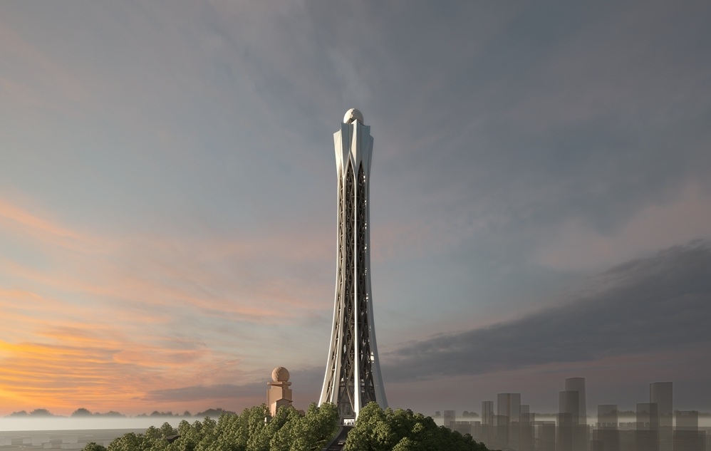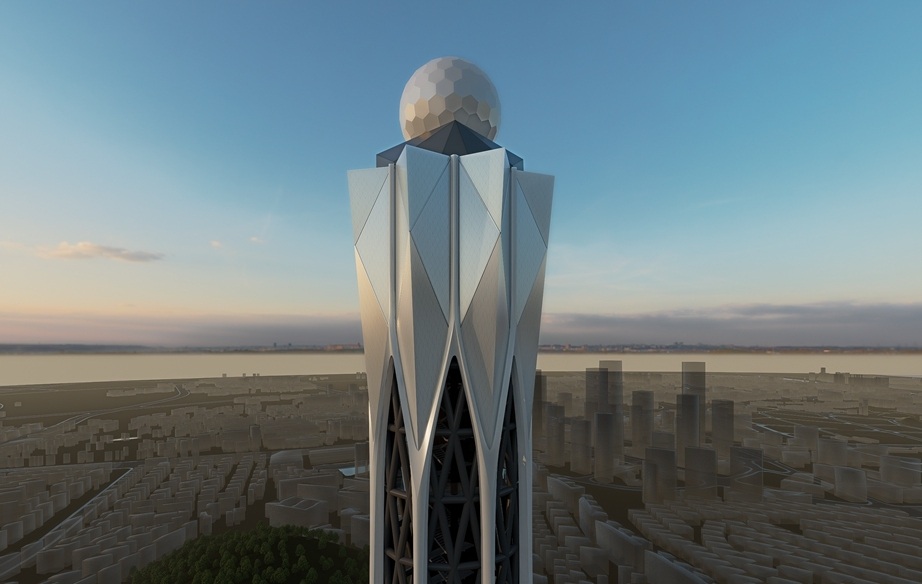 大镇岗气象塔位于番禺区南村镇大镇岗山顶,海拔高度335.25米(塔身主体高度190米),与广州塔遥相呼应。项目占地约4345平方米,总建筑面积4411.85平方米,单体最大层数为地上10层。该塔采用“斜交钢管网格筒体+铝板幕墙”结构体系,外立面以流线型竖向肋条为设计语言,顶部气象观测球如一颗闪耀的“明珠”,结合夜晚灯光,星星点点的塔身将成为番禺新的标志性建筑。