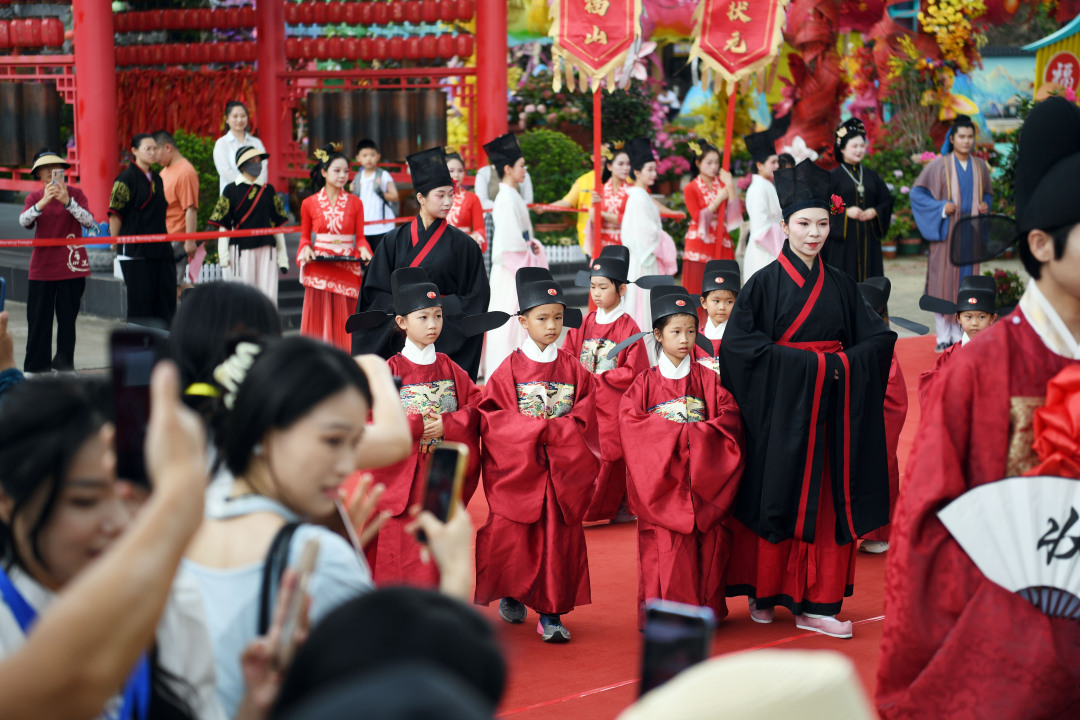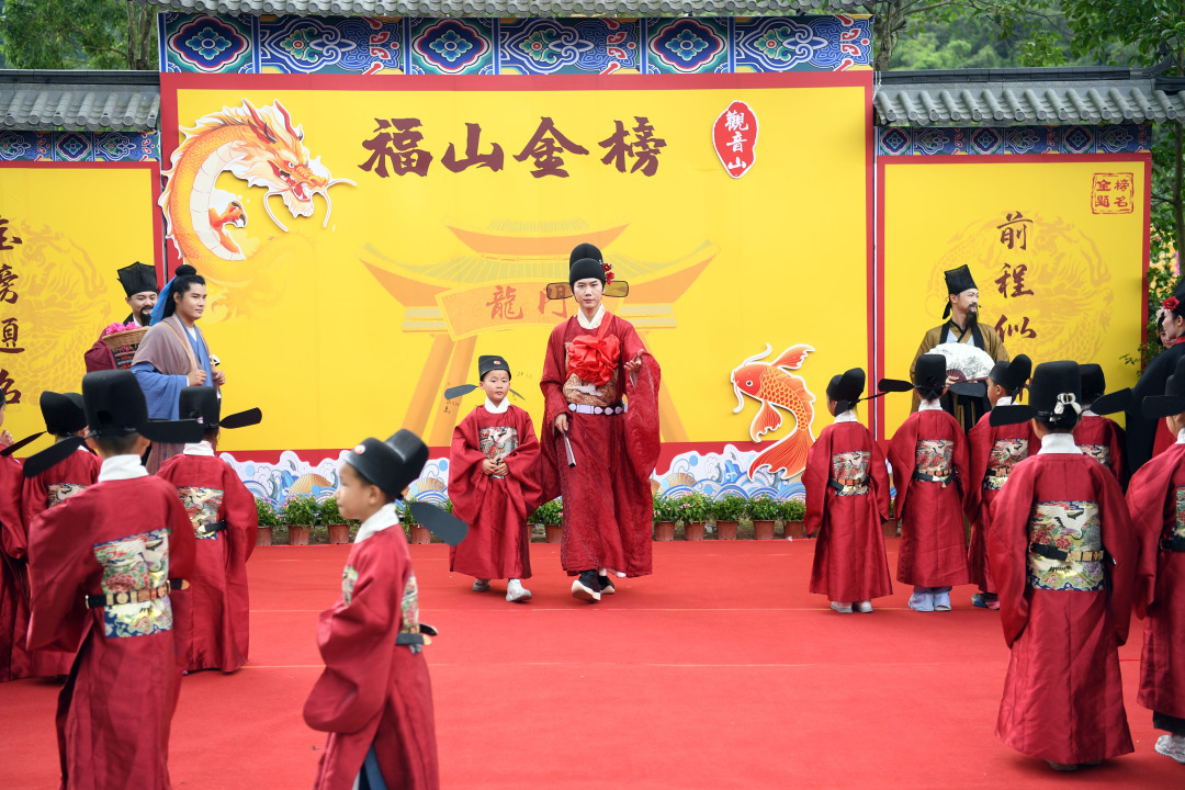 11时整,开场舞《鱼跃龙门》上演,红衣舞者翻腾跃动,水袖如锦鲤溯流而上,激励学子们要“逆流勇进”。“苏东坡”特型演员带来的是名篇吟诵,引来热烈掌声。数十位“小状元”登场,夫子造型的演员为他们正衣冠、点朱砂,现场掌声热烈。其后,巡游互动启动,“状元郎”意气风发,游客纷纷与他合影“沾喜气”。巡游队伍行经圆楼金榜时,“小状元”们在金榜题写心愿,“状元郎”为现场的孩子们送状元福牌,将现场气氛推向高潮。