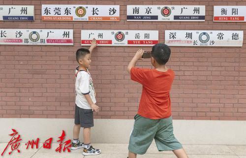 5月17日,两名小游客在广州铁路博物馆列车方向牌展示墙前拍照。