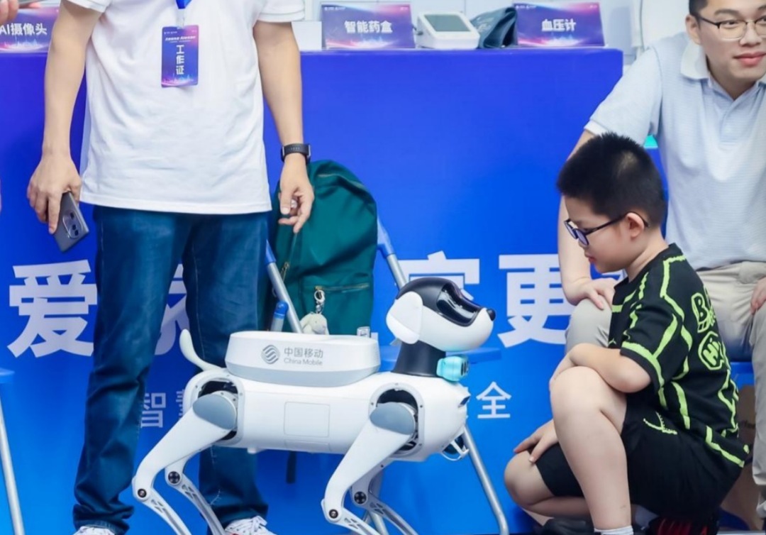 AI技术的场景化落地成为活动另一大焦点。搭载“灵犀智能体×DeepSeek双智能”系统的中移磐石AI手机备受银发族的关注。该手机围绕潮玩+、健康+、娱乐+、安心+、智控+五大核心板块,推出“语音互动、视频通话文字转写、康养监测与反诈提醒”等功能,让老年用户直呼“操作简单又安心”。在展区的AI机械狗同样吸睛无数。它不仅可灵活完成奔跑、倒立、越障、用机械臂送快递等高难度动作,还能通过AI大模型与观众上演温情互动,被赞为“家庭智能伴侣”。