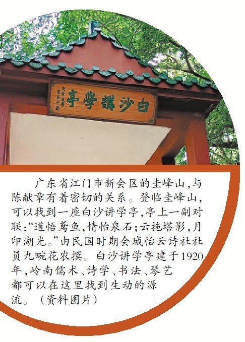 陈献章虽做过官但仅为虚衔,且时间很短,他一生大部分时间都是在讲学中度过的。其主要讲学场所有小庐山书屋、碧玉楼、江门钓台、嘉会楼等。其中位于今天江门市白沙公园的嘉会楼“地凡若干亩,楼凡三楹,高若干丈,广如之……山环水绕,足称名胜”,规模大,环境优美,是白沙讲学之所中最大、最好的一处,“当事为韧嘉会楼,及门宾友相与讲论不倦”。