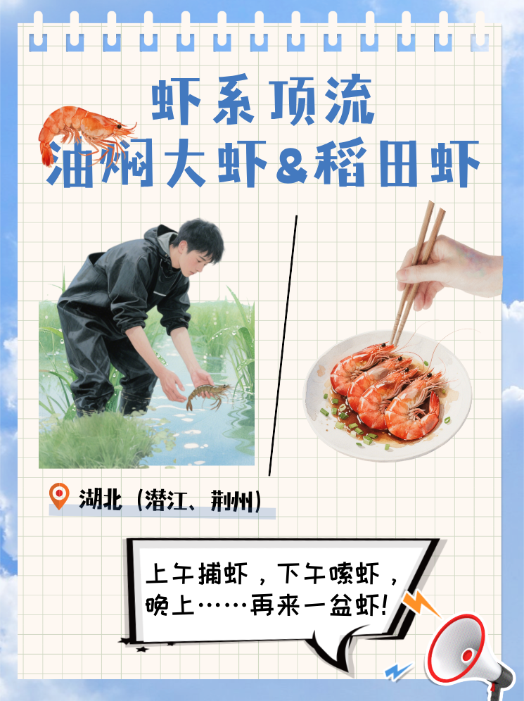 ◆湖北:潜江、荆州的油焖大虾和稻田虾吸引食客体验捕虾烹虾的农家乐趣;