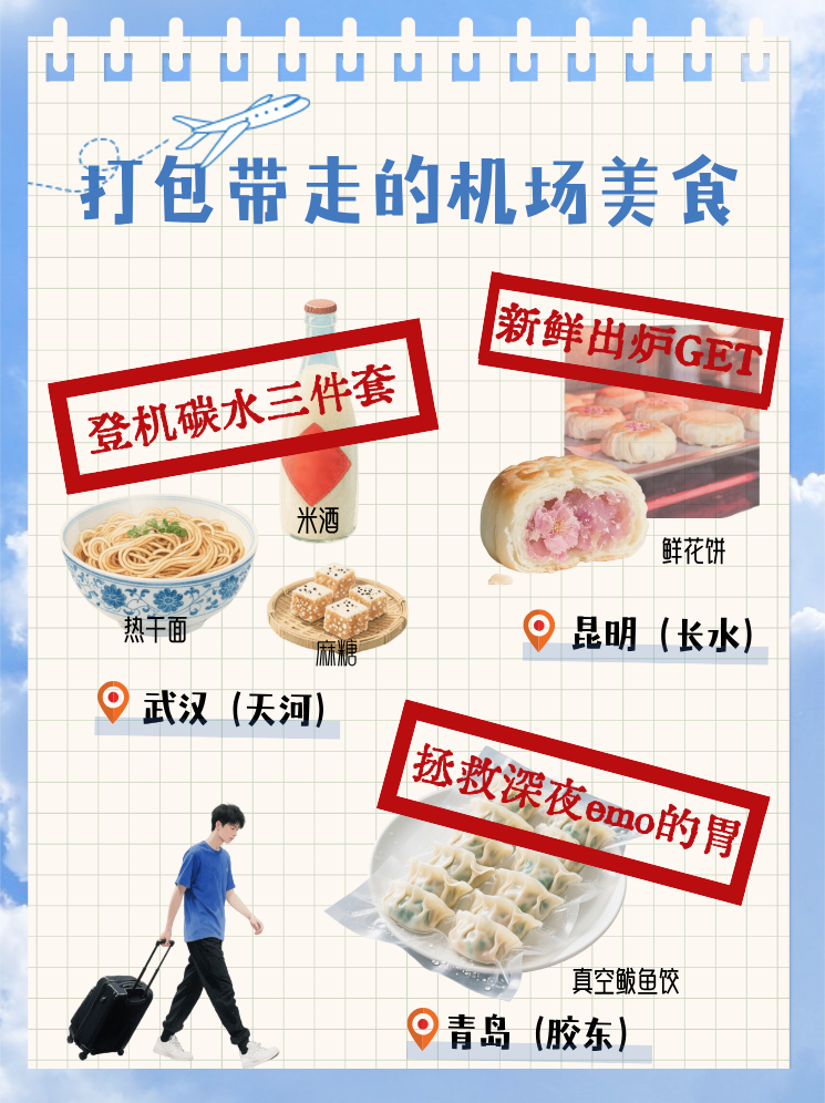 此外,部分地区的机场、火车站,也提供了时令美食和地方特色的打包服务,例如武汉天河机场热干面、神霖米酒、孝感麻糖“荆楚小食三件套”;昆明长水机场的鲜花饼;青岛胶东国际机场有真空包装的鲅鱼水饺;南京南站有金陵饭店古法盐水鸭高铁专供礼盒等。