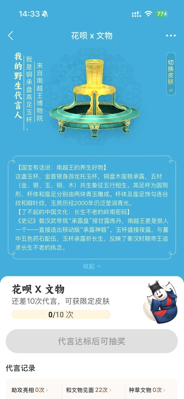 5月18日是第49个“国际博物馆日”。当日,南越王博物院的“铜承盘高足玉杯”,登上了花呗文物皮肤。这件西汉时期“五材共生”的珍宝,以崭新的方式走进时下年轻人的生活。