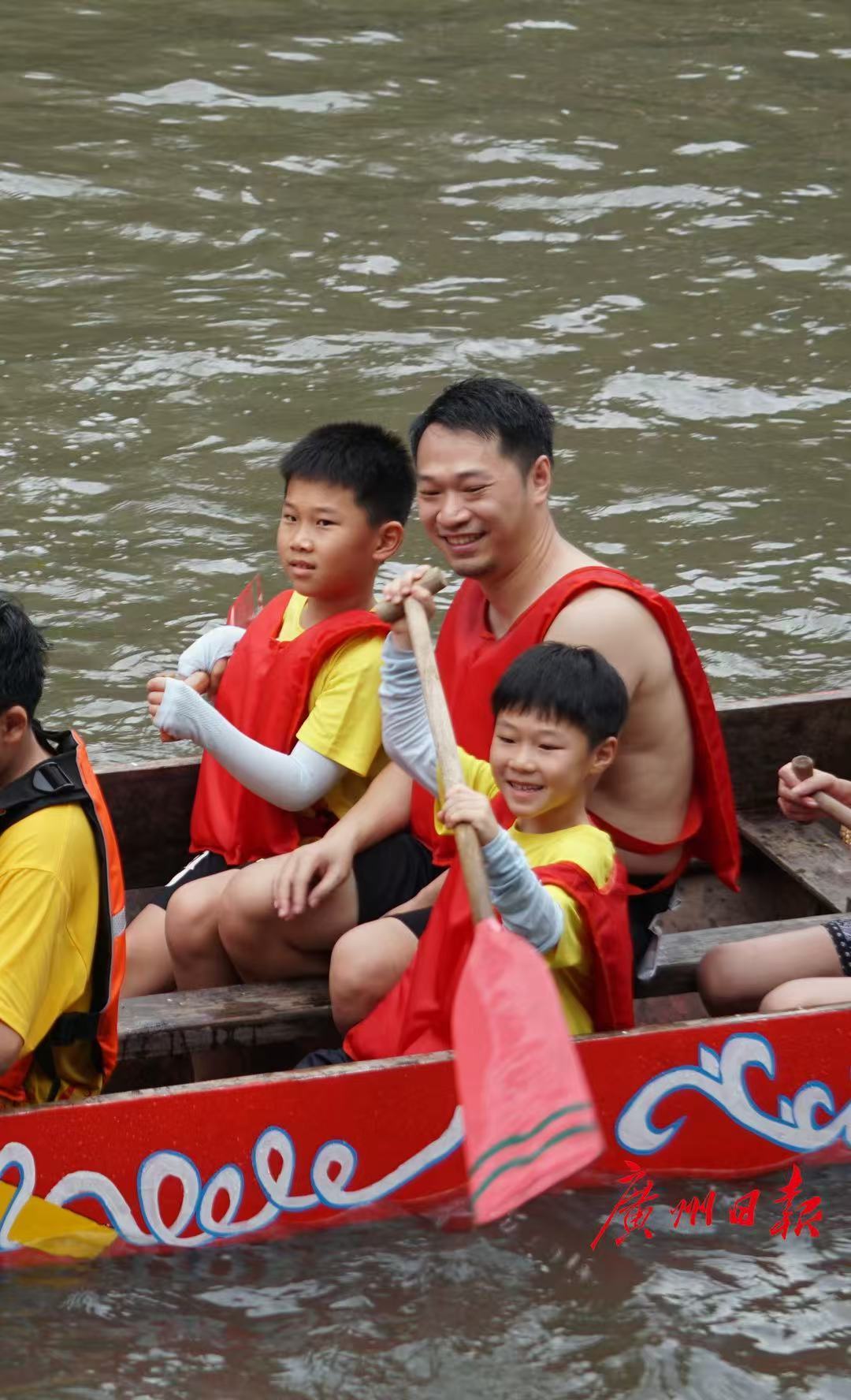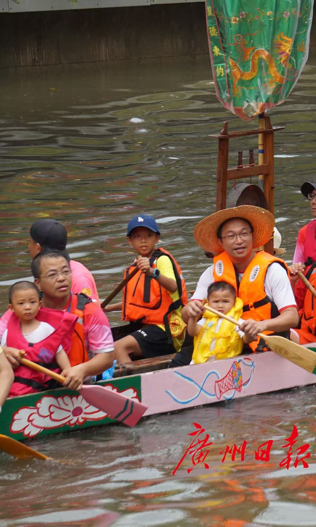 值得关注的是,猎德村的采青仪式有很多村里的小朋友加入。在采青现场,记者看见很多“小扒仔”穿着救生衣,跟着父亲或长辈下船体验。“三代同堂下船的都有,我们希望龙舟文化能代代相传。”李伟时说。