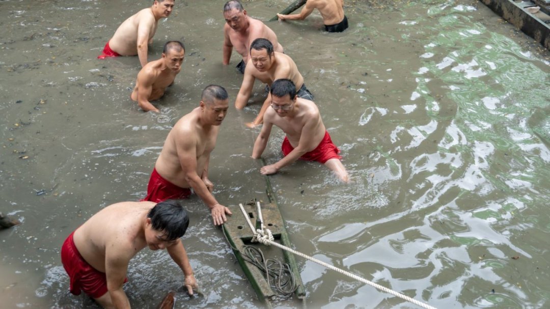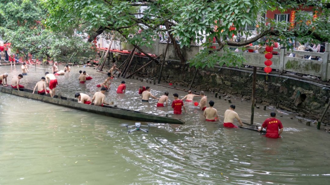 现场,在正式“起龙”之前,村里的“壮丁”们会先吃上一顿丰盛的龙舟饭。“吃饱了才有力、有精神‘起龙’”,“这也是‘丰衣足食’寓意的一种,在黄连一直传承下来。”该村负责人介绍称。随后,为迎接“老龙”的出水,村民举行了一个简单的仪式,宣布正式“起龙”。