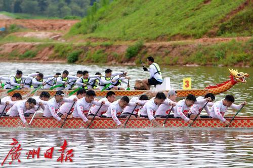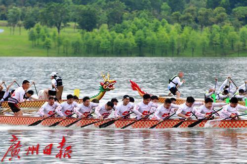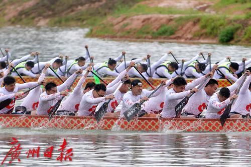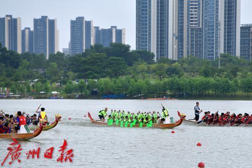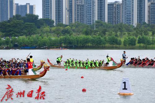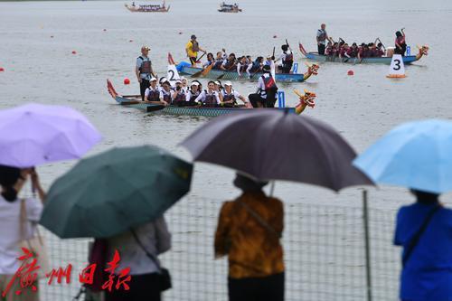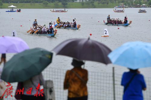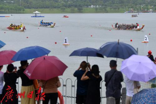 5月18日,“穗城源”第三届九龙湖龙舟邀请赛决赛在黄埔区知识城九龙湖广场举行,参赛队伍在大雨中比拼竞赛,吸引了众多市民观看。