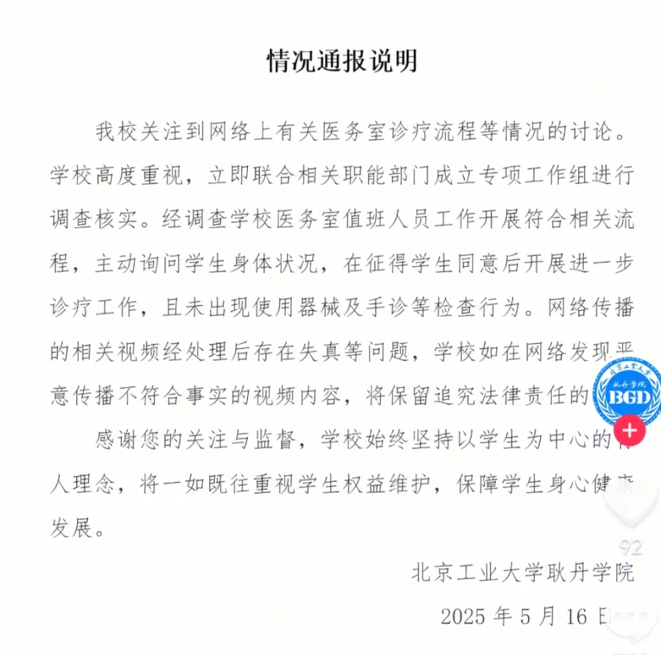 “生理期不舒服去校医室开假条,被要求脱裤子证明。”5月15日,有网友发布视频称,北京工业大学耿丹学院一名女生在生理期不舒服时前往医务室请病假,被要求脱裤子以证明其身体状况。对于此事,该校发布情况通报称学校医务室值班人员工作开展符合相关流程,并指出网络传播的相关视频经处理后存在失真等问题。随后,该校有关工作人员回应记者时表示,相关诊疗规定并非近期才开始实施,目前,学校正在考虑采取其他处理方式。(据读特新闻报道)